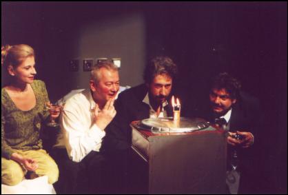 A férjeket alakító Tunyoghi Péter, Balogh András, Safranek Károly ( m. v), az özvegyet s a feleségeket megjelenítő Ivády Erika Dimanopulu Afrodité , Kascsák Dóra, Dér Gabriella, egy színházi kísérlet részeseiként egy kicsit önmagukat is adják. Az improvizációkból felépített jelenetekben érzékelhetően törekedett is erre az író-rendező. Látszólag minden összeáll, aztán mégse. A történetnek van kezdete és vége, a karakterek is elég jól felvázolódtak a közös munka által. Legkivált a három férfi főszereplőt sikerült egyéníteni (A film is erre adott legtöbb támpontot) Nagy kár viszont, hogy a szöveg nem vált irodalmivá, így túl sok a hamis hang, sok a káromlás, a felesleges "baszdmeg". Ez az akciókra is igaz , noha az előadás amúgy dramaturgiailag működik. Ötletes a térszervezés (az egyes helyszínek a nézők előtt, között, fölött vannak kialakítva), jó a ritmus, a színészvezetés is avatott kézre vall...